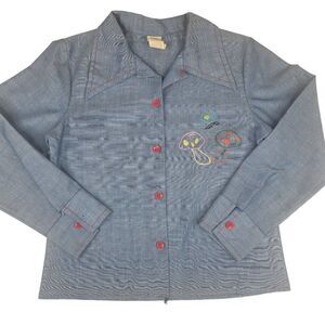 Vintage 70s Embroidered Shirt Womens Small Blue Thumper Mushroom Boho