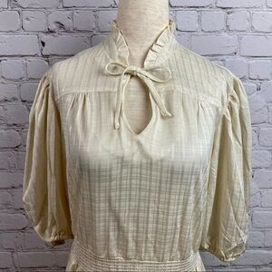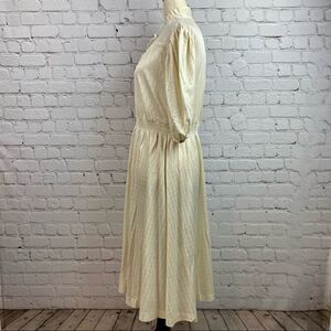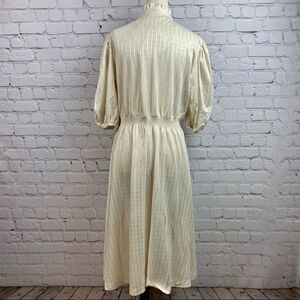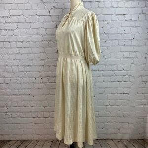 Vintage 70s Ivory Romantic Puff Sleeve Shimmer Summer Tea Length Blouson Dress
