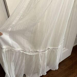 Vintage 70s Audrey Marlett for Jack Kramer White V Neck Crinkle Cloth Polyester 3/4 Flutter Sleeve Maxi Dress with lace & and embroidered ribbon trim