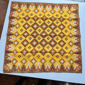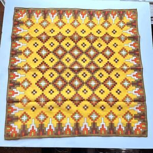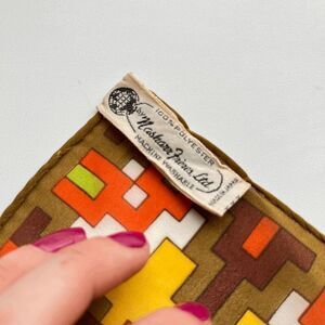 Vintage 1970s Nasharr Freres sheer scarf featuring a bold geometric print in mustard yellow, brown, orange, white, and green. The pixelated, cross-stitch-inspired pattern creates a retro, eye-catching look. Made in Japan with a lightweight, semi-sheer 100% polyester fabric that drapes effortlessly, this scarf is finished with delicate hand-rolled edges for a refined touch. Measuring approximately 21” x 20.5”, it’s versatile for styling as a neckerchief, headscarf, or bag accessory. Machine washable for easy care. Good vintage condition with a small mark noted (see photos).