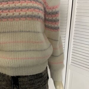 Soft stretchy fuzzy white pullover crew neck sweater with pink and pale blueish-gray lavender stripes. Striped have eyelet knit. Stripes fitted through sleeve then slowly balloon out to ribbed knit cuffs. Excellent vintage condition. No labels. Estate piece. Listed Medium. Please see measurements below.