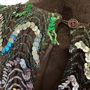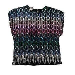 Vintage 70’s Rainbow Sequin Disco Top. Fully embellished with rainbow sequins throughout. Boxy fit. Short cap dolman style short sleeves. Crew neckline. Button closure in back with keyhole opening. Nylon. Dry clean only. Measurements in pictures. Rare find, true vintage.