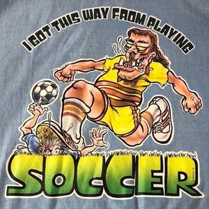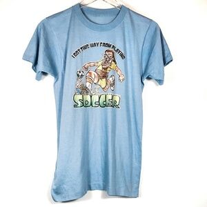 Vintage 1978 I Got This Way From Playing Soccer T-Shirt. Baby blue shirt. Iron on, single stitch. Great pre-owned condition, no visible defects, graphics look great. There is no tag inside the shirt, please see measurements. Measuring a size small. Graphic says Roach '78.