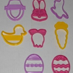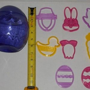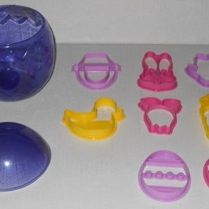 Vintage Beautifully Designed Wilton Cookie Cutters Shapes Holiday Easter Bunny Head Carrot Egg Set 8 Pc Kids Friendly Plastic. Easy Clean, Easy to Use. Comes in a large purple egg shape storage container.