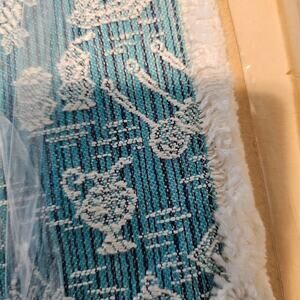 -Blue with white embroidered designs of coffee pots, bowls