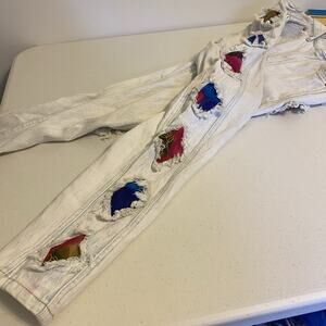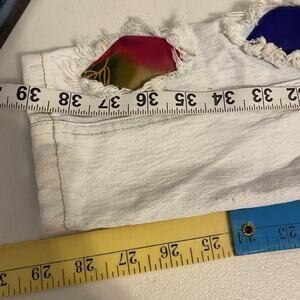These Vintage 80's Anti Basic Women Daily Jeans are a high-rise, 5/6 size with a button closure and a slim fit. The denim fabric features an acid wash blue patchwork design with crochet knit accents, adding a unique and retro touch to the classic style. With a 29-inch inseam and a 23-inch waist size, these handmade jeans are machine washable and perfect for year-round wear, embodying the fashion trends of the 80s and 90s with a modern twist.