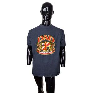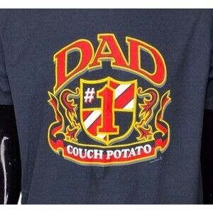 Vintage black, red, yellow, shield "Dad #1 Couch Potato" raised graphic t-shirt men's size is marked XL fits a modern L/XL USA made single stitch, super shirts, Hanes Beefy-T