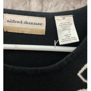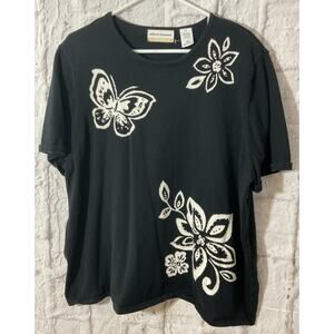 Step back in time with this vintage Alfred Dunner sweater! This black sweater features charming white and black butterflies, delicate flowers, and eye-catching beads, making it a unique addition to your wardrobe.