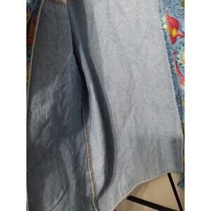 American dungaree brand made in USA lightweight denim Blazer jacket button up floral Tapestry on the shoulders and on the back shoulders sleeves can be worn full or cuff to good size pockets in the front nice small seam around all edges women's size large and pre-owned good condition no major flaws but there are small signs of wear see photos for extra description this jacket is a classic from the '80s and '90s era what is thriving and trending right now would look cute thrown over a dress with a pair of jeans leggings very versatile to dress up or go casual unique boho country chic fairy whimsical Western cowgirl Homestead crunchy