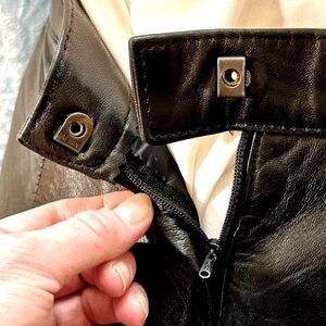 Buttery soft like lambskin black leather skirt with side slip pockets, small back slit and lined. Back zip and hook closure.