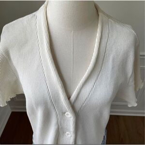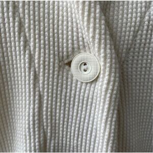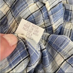 90s Barbara Lesser dress but it’s made in the USA so it is possible it’s late 80s- prairie style dress. Waffle thermal material Vneck top with buttons and short sleeves that are finished with a lettuce hem, and a plaid seersucker skirt, falling from the waist in shades of blue. The top is cotton Lycra blend, and the skirt is acetate and rayon (the acetate surprised me, it feels more like rayon seersucker). Very on trend with today’s current cottage core Prairie country western aesthetic. No noted flaws. Tag size large, but please double check measurements to ensure the proper fit for you as the fit is supposed to be loose and relaxed. Measurements are approximate and taken while laying flat: 19 inches straight across the waist, 19 inches from armpits to armpit and 53.5 inches shoulder to hem.