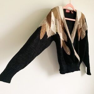 Vintage 80s 90s Black Tan Leaf Sequin Embroidered Crossover Sweater Medium