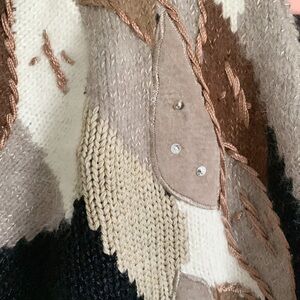 Vintage 80s 90s Black Tan Leaf Sequin Embroidered Crossover Sweater. Size Medium but runs slightly smaller and I would say fits a small better. Listing size according to actual fit. I’m absolutely obsessed with this sweater. It’s so chic and sexy. Slightly cropped as you can see in the modeled photos. Crosses over in the front. The brown and white parts are fuzzy and soft. Has shoulder pads but you could easily cut them out if you prefer. Excellent condition!