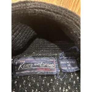 This vintage 90s men's cardigan features a classic black and white geometric pattern, made from acrylic knit fabric. With a size L and a regular fit, this cardigan is perfect for adding a touch of retro style to any outfit. Proudly made in the USA by The Keats And Lyford brand, this cardigan is a timeless piece for any man's wardrobe.