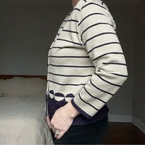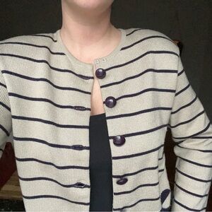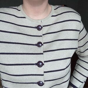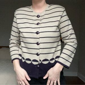 Tan sweater with navy horizontal stripes and art deco circular pattern near hem. Chunk navy buttons. Shoulder pads. 3/4 length sleeve. cropped look. Button down cardigan style. Made in USA