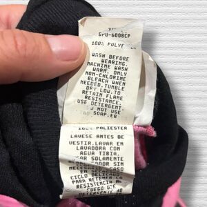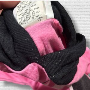 Adorable vintage Disney Babies Minnie Mouse sleeper from the late 1980s / early 1990s. Features a bright pink body with large Minnie face graphic, polka dot bow, and attached black hood with mouse ears. Made of flame-resistant polyester. Tag shows Baby Mickey Collection / Disney Babies branding.