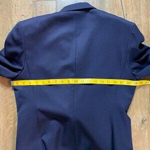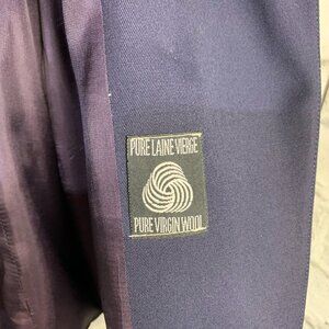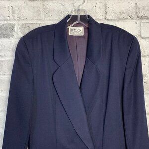 Vintage 80s 90s Mr Jax navy blue medium weight pure virgin wool double breasted long structured blazer. Gold buttons, structured shoulder pads, full satin lined. This would look amazing paired over a full a-line midi skirt, the perfect office workwear piece. Please reference discolouring under arm pits otherwise in good used vintage condition.