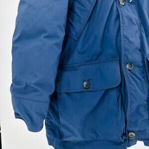 Excellent vintage condition. Removable goose down insulation liner. Real fur trim hood with drawstring. Full front zip and button closure. Multiple front pockets with button flaps. Adjustable cuffs and waist ties. Shell: 65% polyester, 35% cotton. Lining: 100% nylon. Insulation: 100% goose down. Made in U.S.A.