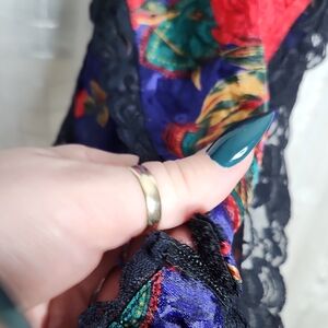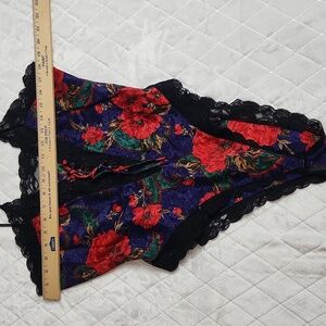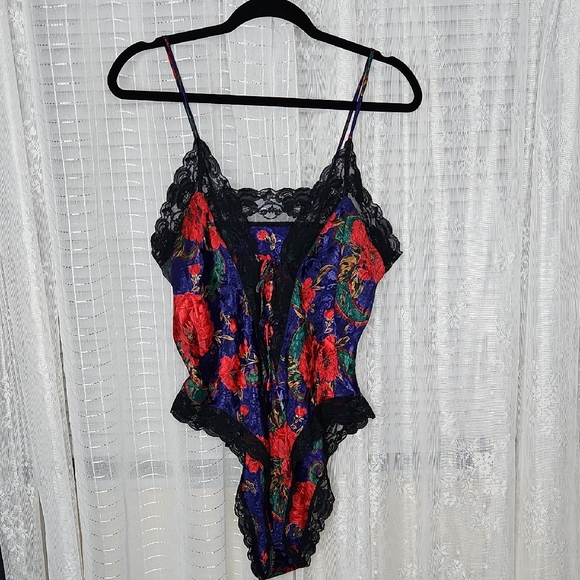 Vintage 80's 90's Floral Black Lace Lined V-Neck Teddy Trashy Lingerie size small. This bodysuit is in like new vintage condition. The material is smooth and flowy and offers no stretch, with a button crotch. The size and material tags are missing but it seems to be a ladies small to me. Approx. measurements in pics.