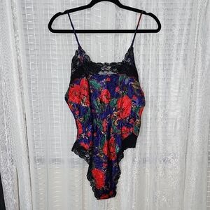 Elegant floral bodysuit with lace trim. Features vibrant red and blue colors.