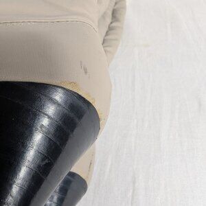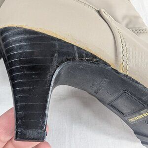 These boots have been barely worn, however there's some glue near the heels and a few other various marks - please see photos. The zippers are a little tough, from not being worn much. Heel is approximately 3" and the total boot is approximately 14" tall.