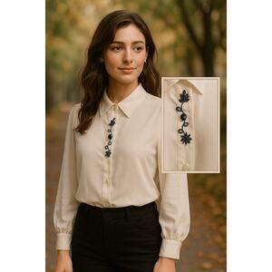 Step back into classic 80s/90s style with this vintage embroidered blouse, a timeless piece that adds effortless charm to any wardrobe. Made in the USA by G.W. Division of Graff Petite, this size 6 top features delicate blue floral embroidery down the front, pearl-style buttons, and long sleeves with button cuffs.