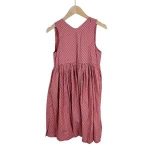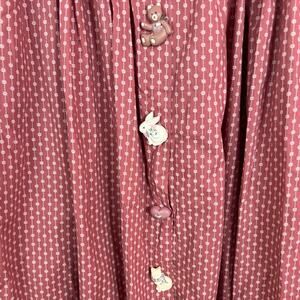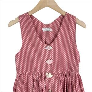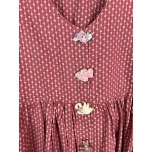 Vintage kids dress. From the late 80s or early 90s. Mauve pink with white detail. Sleeveless. Unique buttons down the front include: flowers. hearts. swan. teddy bear, bunny, cat. From Country Collectibles in Hartsville, SC. No other tags so I am unsure of size. See measurements below.