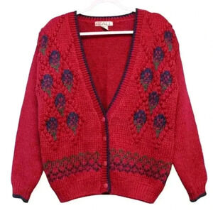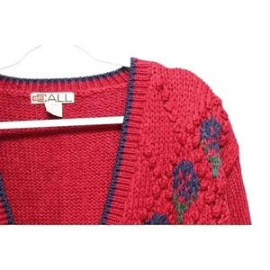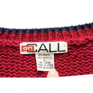 This vintage cardigan sweater is a classic piece from the 80s/90s featuring a fun argyle/diamond pattern in bold red. The chunky-knit design with long sleeves and a V-neckline creates a stylish and comfortable fit, perfect for the winter, fall, or spring seasons. The sweater is made of a soft blend of ramie and acrylic materials and features shoulder pads for a structured silhouette and button accents for added flair. The On Call brand grandpa cardigan is a perfect addition to any wardrobe, with its classic fit and vintage charm. The sweater is perfect for any occasion, whether it's a fun holiday like Christmas or a quirky 80s/90s themed party. The colorful and preppy design is sure to make a statement, while the comfortable knit fabric ensures you can wear it all day long.