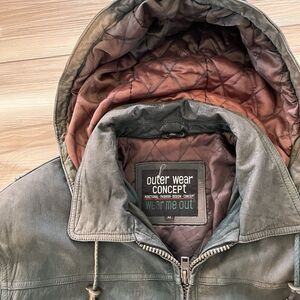This coat is in good used condition-- it doesn't look brand new, it has signs of wear. Leather and lining are faded or sun bleached in areas. The leather color is VERY non-uniform. Despite the variegation to the color, this jacket has held up very well. Stitching is in tact with the exception of a few lines of stiches in the hood. No tears, one pocket has a hole which I mended and you may feel the difference but I'm a decent mender. The hood is detachable, the lining in the hood has a lot of sun bleaching. Personally I would ditch the hood because I prefer just a collar (style-wise) but I'll leave it up to you.