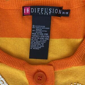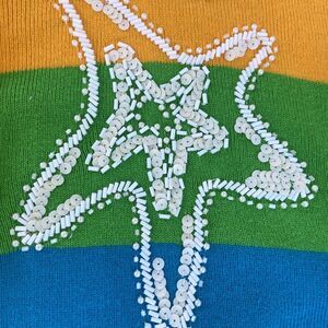 Fun and bright vintage 1990's IB Diffusion striped cardigan. Beaded and sequin ocean creatures. Two pockets. Acrylic and cotton blend, has stretch. Not lined.