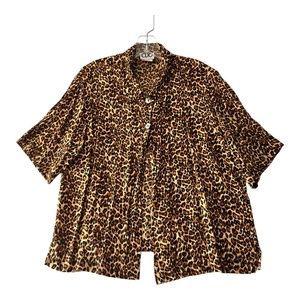Flowy leopard cheetah print blouse. Good baggy over shirt for layering, perhaps over a graphic tee? Also good tied up for a cropped look. Bottom buttons are gone, top two remain, but I think it’s a cute look.