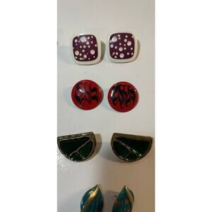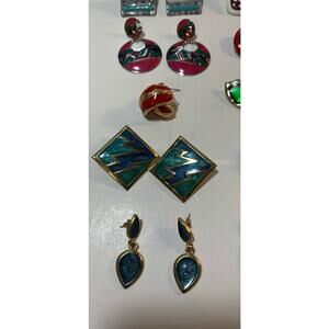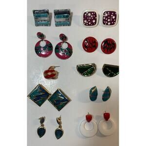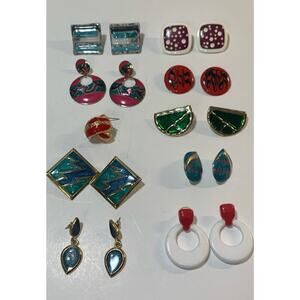 This listing is for a lot of 10 different pairs of vintage 80's/90's statement pierced earrings for women. The earrings are bold, multicolored, and feature a retro style, perfect for adding a touch of bling to any outfit. These stud earrings are sure to make a statement and evoke a sense of nostalgia with their bold designs from the past. Perfect for those who appreciate unique and eye-catching jewelry pieces.