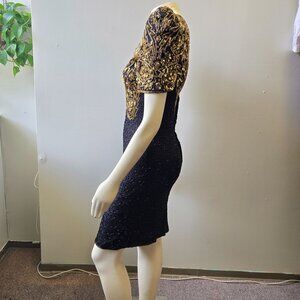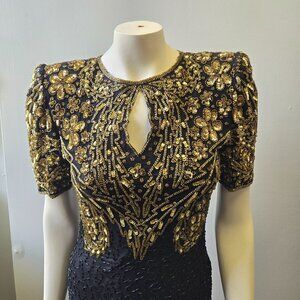 tags/keywords: beaded dress, formal dress, silk dress, black gold dress, evening wear, short sleeve dress, Mark & John By Sam, floral beading, luxury dress, vintage style dress, Indian silk, embellished dress, elegant attire, 90s, cocktail dress, 80s, sparkly, shoulder pads, artsy, art to wear, maximalist, nye, holiday, glam, gala