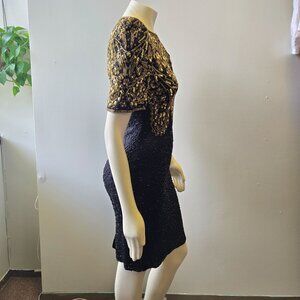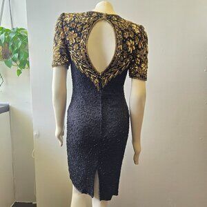 Vintage 80s 90s Mark & John By Sam Black Gold Beaded Silk Dress Gala Glam Cockta