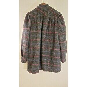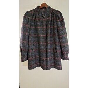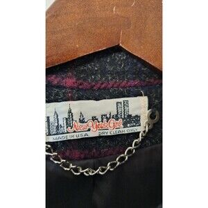 This vintage made in USA 1980's 1990's New York Girl plaid stripe tweed coat is a must-have for any fashion-forward woman. The wool blend fabric is perfect for keeping you warm during the colder seasons, while the button and snap closure adds a touch of sophistication to any outfit. With its mid-length and striped pattern, this coat is perfect for travel, casual wear, workwear, or even business attire. The coat is lined with wool blend and has pockets for added convenience. It's a regular fit and comes in a plus size 16. This coat is a great addition to any wardrobe and is sure to make a statement wherever you go. PTP 25 in. Length 32 in,. Sleeves 25 in.