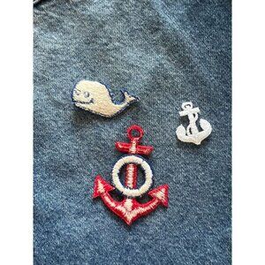 Vintage embroidered sew-on patch trio featuring a smiling whale, a bold red anchor with a life ring, and a small white anchor. These detailed appliqués add classic nautical charm to denim jackets, jeans, tote bags, or DIY upcycled projects.