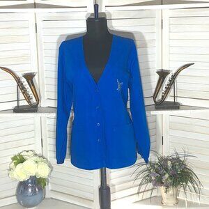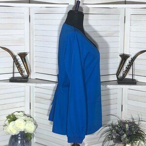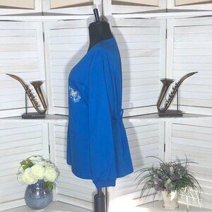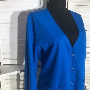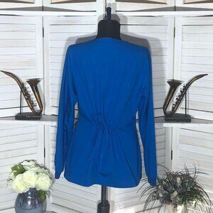 Vintage 80s 90s nurse scrub top with buttoned front and long sleeves in blue, size Small.
