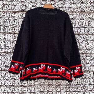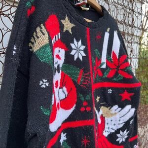 Vintage 80s 90s Nutcracker ugly Christmas holiday sweater featuring a snowman, candles, a tree, and an Angel. Black crochet scalloped trim (is unraveling a bit in hem)