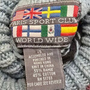 Vintage turtleneck sweater by PARIS SPORTS CLUB WORLD WIDE. Light blue with pink pink, purple, navy and teal flowers, hearts and peace signs. Very gool vintage condition. No rips, holes or stains noted.