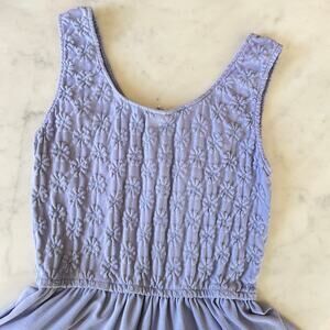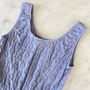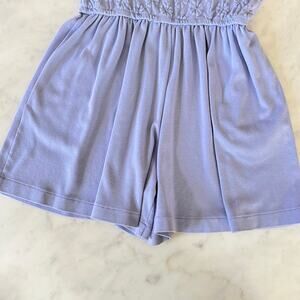Vintage 80s/90s periwinkle sleeveless romper with floral embroidery on top part. Has pockets! Elastic waist, neckline and sleeve trim. Scoop neckline. No size listed, but estimated to fit a S/M-- please check measurements below! In GUC with minor pilling. Has a nice cut -- tighter fit on top and flowy/loose fitting shorts. Made in the USA.
