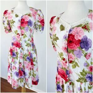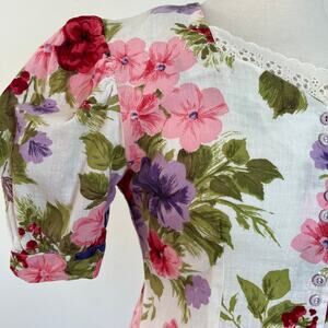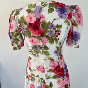 Vintage 80s / 90s Pink Red Floral Mini Dress Short Puff Sleeve Cottagecore Laura Ashley // Size Medium