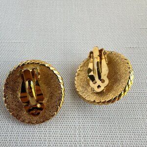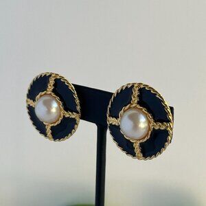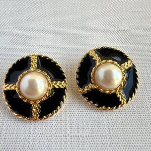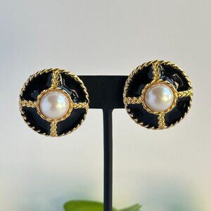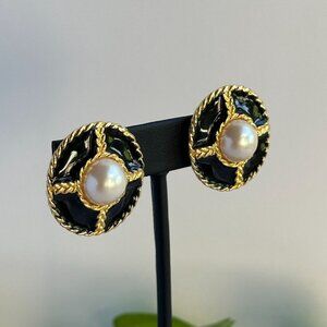 Vintage 80s 90s Round Black Enamel & Faux Pearl Clip-On Earrings 1.25" Gold-Tone