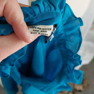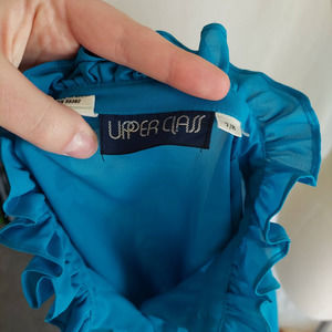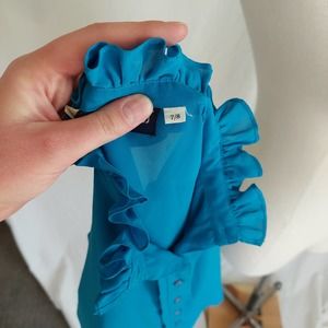 Vintage 80s 90s Upper Class Ruffle Mockneck Button-Up Blouse, marked as a size 7/8. Bracelet sleeve length, with ruffle trim. Slightly sheer. In good vintage condition. From a cat-friendly home.