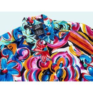 Pretty vintage blouse by Sasson. Full button. Bright color abstract floral print. Collar. Shoulder pads. Circa 80s 90s. 100% rayon. Beaded detail outlining design. Pre-owned and gently worn in really nice condition!
