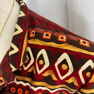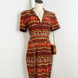 Vintage 80 90s Short Sleeve Maxi/Mid Collared Dress, Real Buttons Down Full Front. Bold Geometric Striped Print in Shades of Red, Orange, Brown, Yellow, and Cream. Features Waist Darts and Shoulder Pads (Could Be Removed). J. Stevens Brand, Tag Size 10, Good Condition light fabric wear