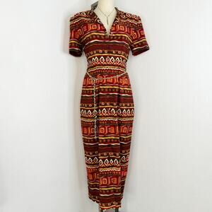 Vintage 80s 90s Short Sleeve Maxi/Midi Collared Button Front Printed Dress SZ 10