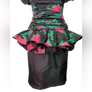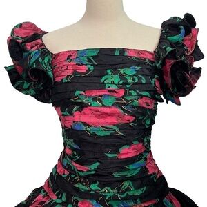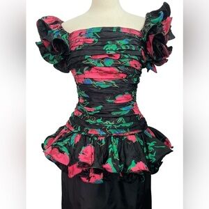 This fantastic quintessential 80’s party formal dress has a full peplum waist with multiple wired ruffle layers. Ruffle off the shoulder sleeves. A beautiful pink, green, blue & gold hand painted floral print contrasted with a solid black skirt. Pleated bodice and back. Wide square neckline with a back zip closure. Great vintage condition with a few minor flaws on skirt. Please see all photos for details. Marked size 4 but may run small due to being vintage. Please see all measurements below to ensure proper fit!
