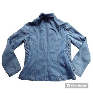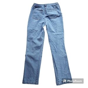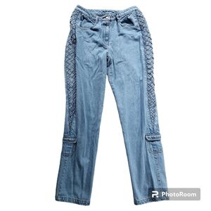 Vintage 80s 90s Together Braided Denim Jacket and Jeans set. Lighter wash, jacket has a couple white spots on it (pics). braided denim down the sides of both pieces, pants have cute little cargo pockets at the bottom, high rise relaxed fit mom jeans. Jeans are sz 12, measurements in pics. Jacket has 2 Zipper pockets and is a size 10. Flat measurements for jacket approximately