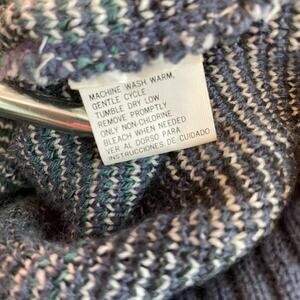 Soft knit blend of 90% acrylic 9% nylon 1% polyester in a dusty blue with minty green and white. Geometric southwestern design, with stripes and diamond argyle Aztec patterns.
