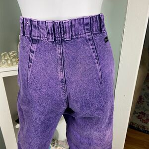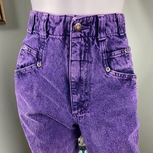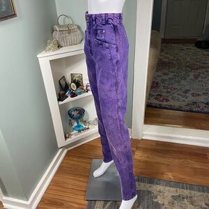 Vintage 1980's Silver Lake Wrangler bareback western jeans. Acid wash/washed purple. Super high waist/rise. Tapered leg. Lots of belt loops. 100% cotton denim. Tag size is 5/6, fits like a Small. Excellent vintage condition, no issues.